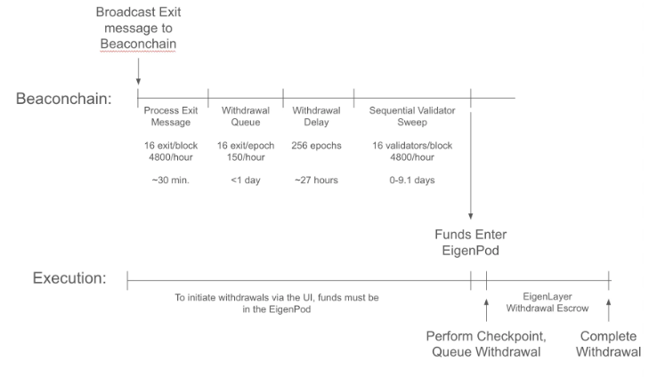 - The BeaconChain withdrawal process (1-10 days) can overlap with the EigenLayer escrow period (7* days) by proactively